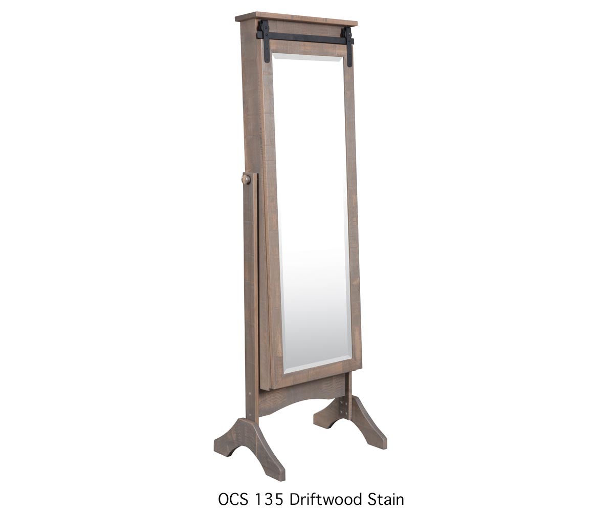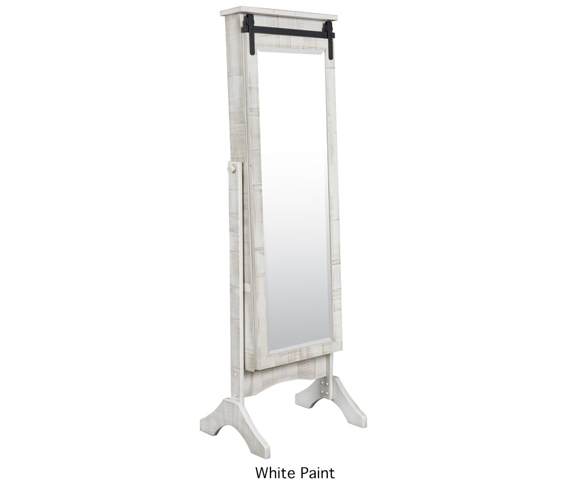 Features: • Barn door track detail to slide open the door • Door slides to show jewelry storage